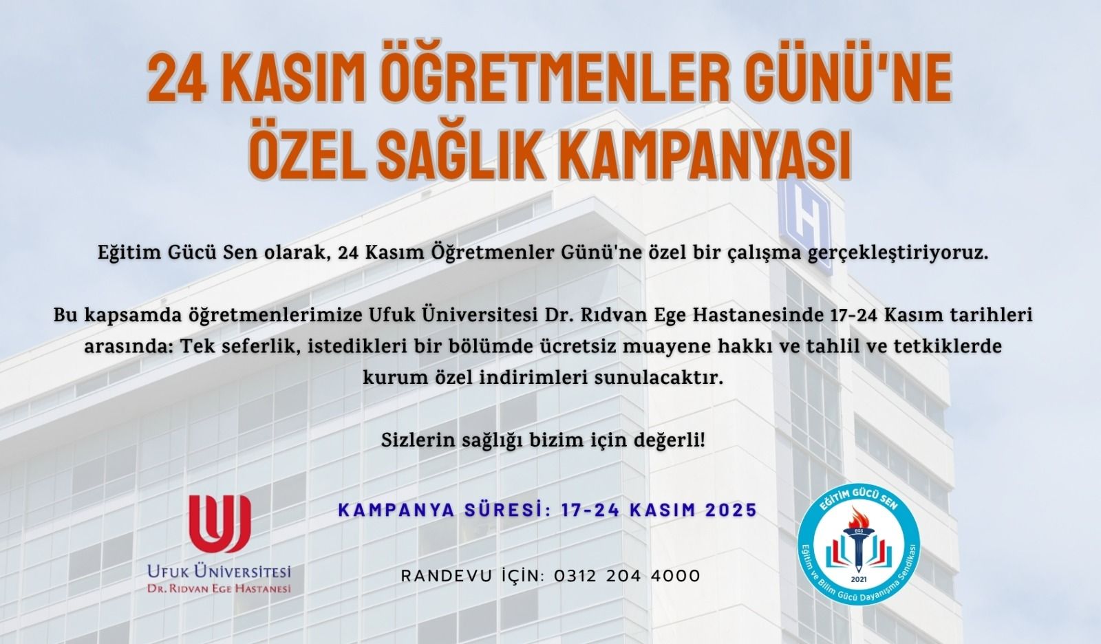 Üyelerimiz ve birinci derece yakınları UFUK ÜNİVERSİTESİ DR. RIDVAN EGE HASTANESİ'nden indirimli hizmet alacaklardır.