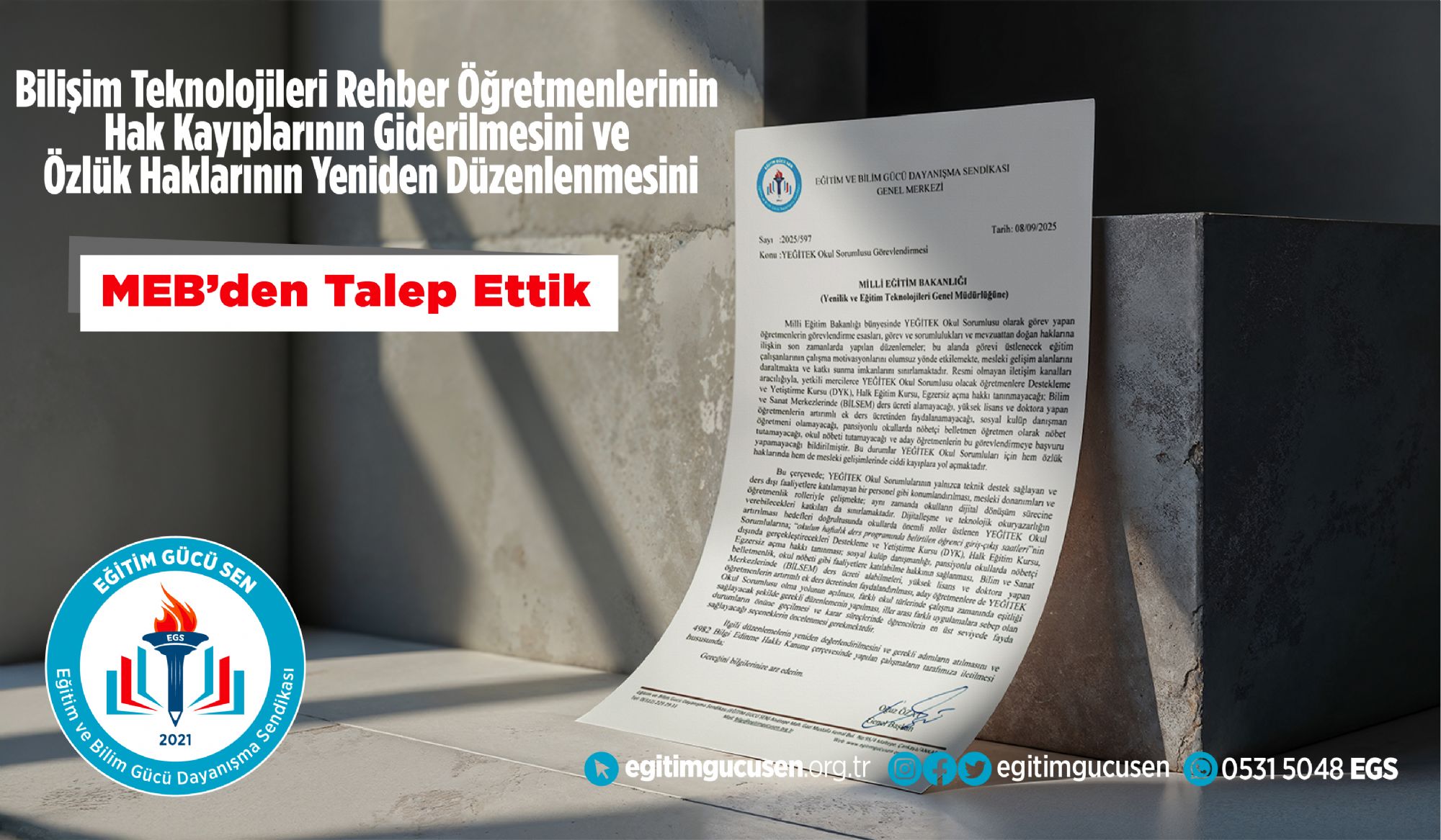 İlgili düzenlemelerin yeniden değerlendirilmesini ve gerekli adımların atılmasını MEB'den talep ettik.