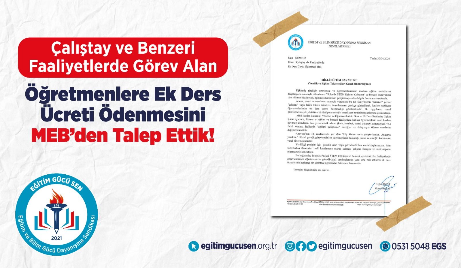 Bu kapsamda sendikamız tarafından; Scientix STEM Eğitimi Çalıştayı ve benzeri içerikteki tüm faaliyetlerde görev alan öğretmenlerin görevli-izinli sayılmalarının yanı sıra, hak ettikleri ek ders ücretlerinin eksiksiz şekilde ödenmesi ve uygulamada birlik sağlanmasına yönelik gerekli düzenlemelerin yapılmasını Millî Eğitim Bakanlığı’ndan talep ettik.