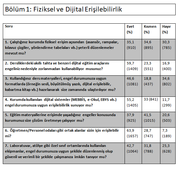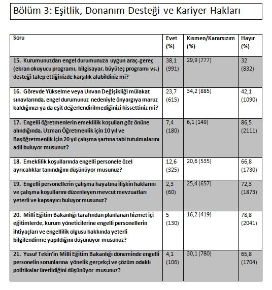 Eğitim Gücü-Sen Engelsiz Eğitim Çalışanları Üst Kurulu; Millî Eğitim Bakanlığı ve YÖK bünyesinde görev yapan 2.590* engelli öğretmen ve eğitim çalışanına yönelik, çalışma hayatındaki durumu tespit etmeye dair 21 soruluk anket çalışması gerçekleştirmiştir. Elde edilen veriler, okullardaki ve kurumlardaki tabloyu tüm açıklığıyla ortaya koymuş; engelli eğitim çalışanlarının karşılaştığı sorunların ciddiyetini gözler önüne serir niteliktedir.