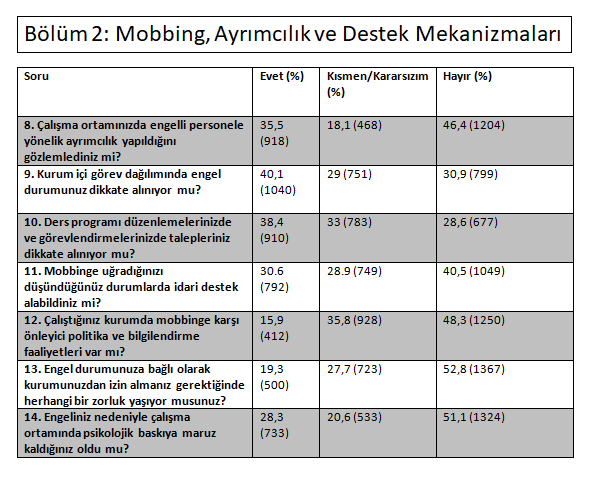 Katılımcıların %35,5 gibi yüksek bir oranı; kurumlarında engelli personele yönelik ayrımcılık yapıldığını gözlemlediğini belirterek, eğitim ortamlarında bile ayrımcı zihniyetin sürdüğünü ve kapsayıcılık anlayışının lafta kaldığını ortaya koymaktadır.