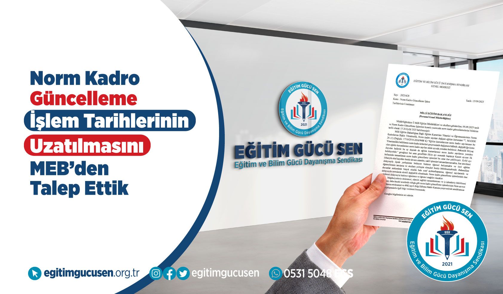 Mağduriyetlerin önlenmesi, sürecin sağlıklı tamamlanması ve iş işlemlerin bitirilmesi açısından; daha önceki senelerde olduğu gibi norm kadro güncelleme işlemlerinin Ekim ayının son haftasına ertelenmesini MEB'den talep ettik.
