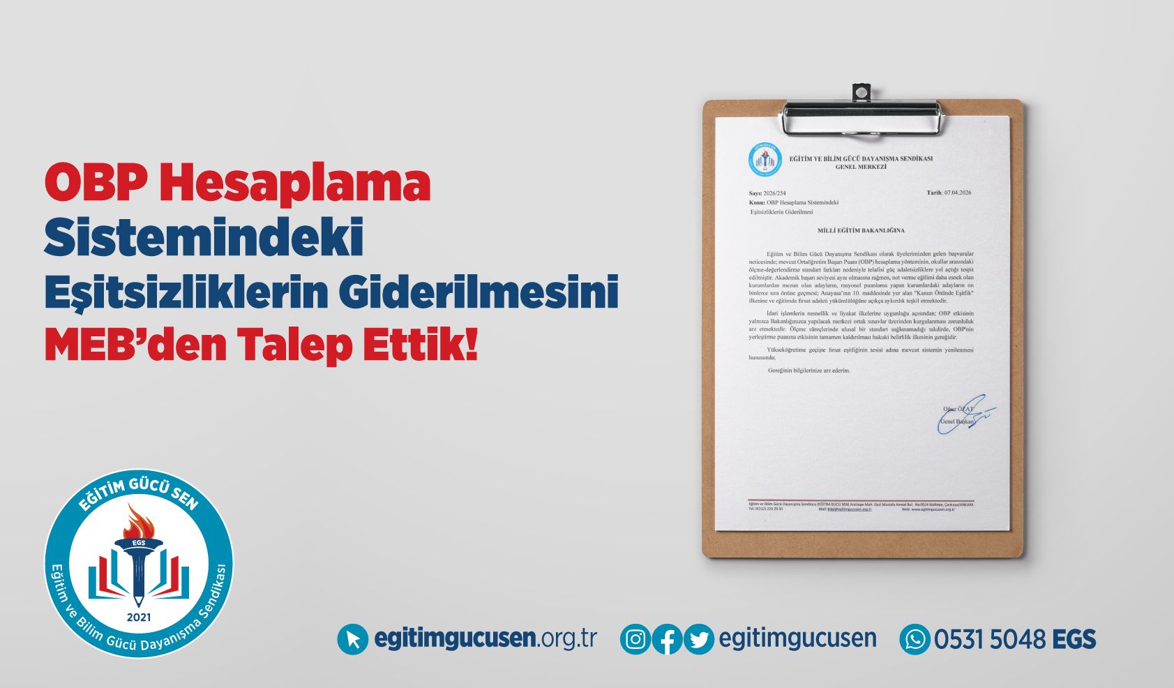 Eğitim ve Bilim Gücü Dayanışma Sendikası olarak üyelerimizden gelen başvurular neticesinde; mevcut Ortaöğretim Başarı Puanı (OBP) hesaplama yönteminin, okullar arasındaki ölçme ve değerlendirme standart farklılıkları nedeniyle ciddi adaletsizliklere yol açtığı değerlendirilmektedir. Akademik başarı seviyesi benzer olan öğrenciler arasında, not verme eğilimi farklılıklarından kaynaklı olarak önemli sıralama farklarının oluşması, eğitimde fırsat eşitliği ilkesini zedelemektedir.