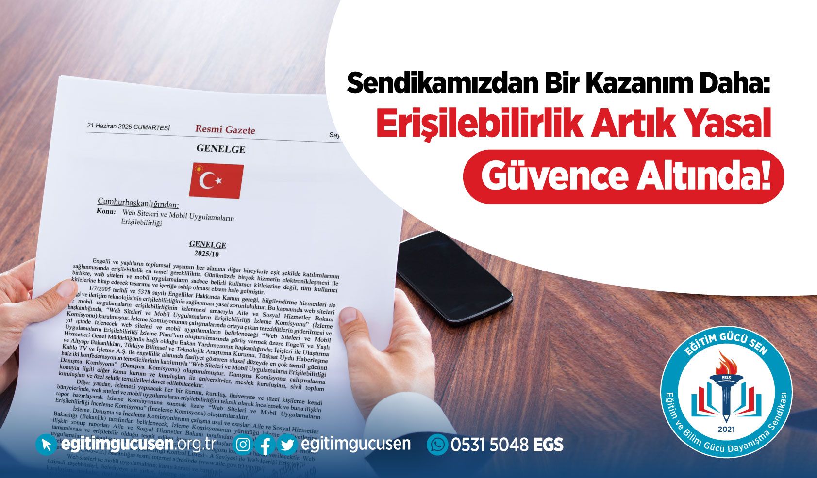 Gerek yazılı talebimiz gerekse siyasi ve bürokratik görüşmelerimiz neticesinde, web siteleri ve mobil uygulamalarda erişilebilirliğin sağlanması artık Resmî Gazete’de yayımlanarak yasal bir zorunluluk haline getirildi. Bu düzenleme ile kamu kurumları, belediyeler, üniversiteler, özel sektör kuruluşları ve kamu hizmeti sunan pek çok yapı 1 yıl, elektronik ticaret yapan hizmet sağlayıcılar ise 2 yıl içinde dijital platformlarını erişilebilir hale getirmekle yükümlü kılındı. Engelli ve yaşlı bireylerin toplumsal yaşama eşit katılımı için önemli bir adım atılmış oldu. Bu kazanım, sendikamızın üyeleri adına sürdürdüğü kararlı mücadelenin doğrudan bir sonucudur.