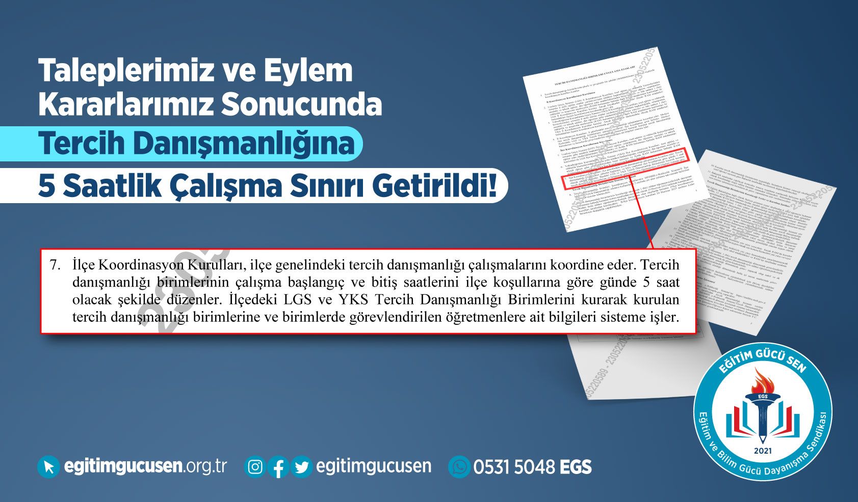 LGS ve YKS tercih danışmanlığı görevlerinde yer alan öğretmenlerin çalışma sürelerine ilişkin sahadan gelen yoğun şikâyetler ve sendikamızın girişimleri doğrultusunda önemli bir düzenleme hayata geçirilmiştir. 2025 yılı itibarıyla yürürlüğe giren uygulama esaslarına göre; tercih danışmanlığı birimlerinin günlük çalışma süresi, ilçe koşulları dikkate alınarak planlanacak ancak toplam görev süresi hiçbir şekilde günlük 5 saati aşamayacaktır.