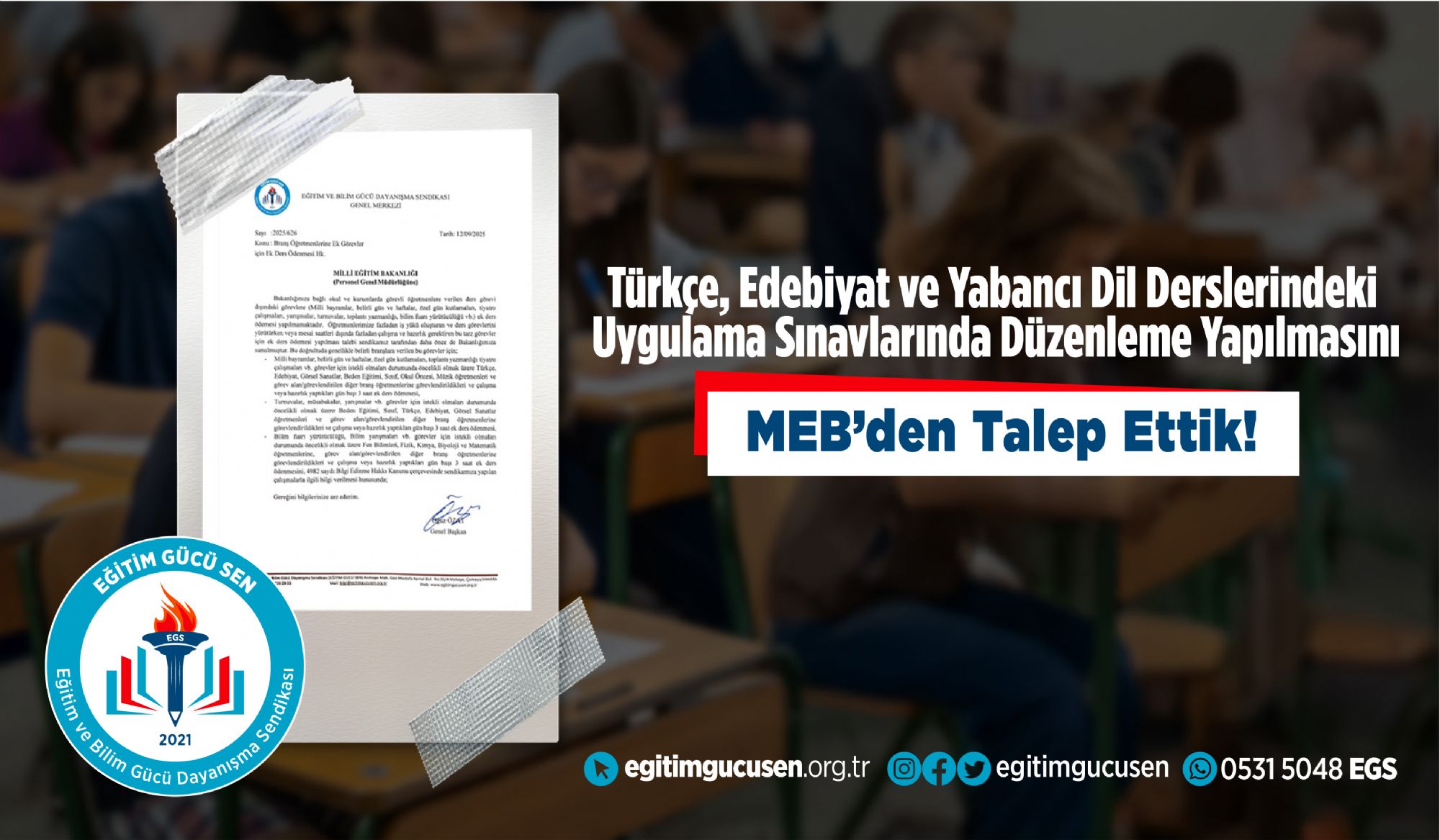 Yıl içinde Bakanlığa bağlı kurumlarda çalışan ilgili branş öğretmenleriyle yaptığımız görüşme ve değerlendirmelerde bu sınavların amacına ulaşmadığı Sendikamız tarafından tespit edilmiştir. Amacına ulaşmayan bu sınavların kaldırılması ya da ilgili yönergede düzenleme yapılarak, uygulama sınavlarının tüm ders yılı içerisine yayılması ve tarihlerin ders öğretmenine bırakılması veya uygulama sınavı getirilen derslerin müfredat içeriğinin sadeleştirilerek uygulama sınavları ve değerlendirmeleri için zaman yaratılmasını MEB'den talep ettik.