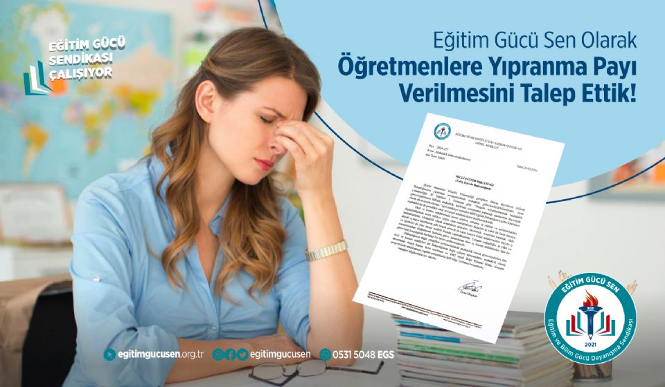 Öğretmenlerin karşılaştığı sorunlar, artan şiddet haberleri mesleğin zorluğunu göstermektedir. Yapılan iş ve mesleğin riskleri ve yıpratıcılığı sebebiyle farklı meslek grubu çalışanları için emeklilik bakımından yıpranma (fiilî hizmet süresi zammı) hakkı uygulanmaktadır. Öğretmenlik mesleğinin de riskleri ve yıpratıcılığı göz önünde bulundurulduğunda öğretmenlere de 4 yıla 1 yıl olacak şekilde yıpranma payı verilmesini talep ettik.