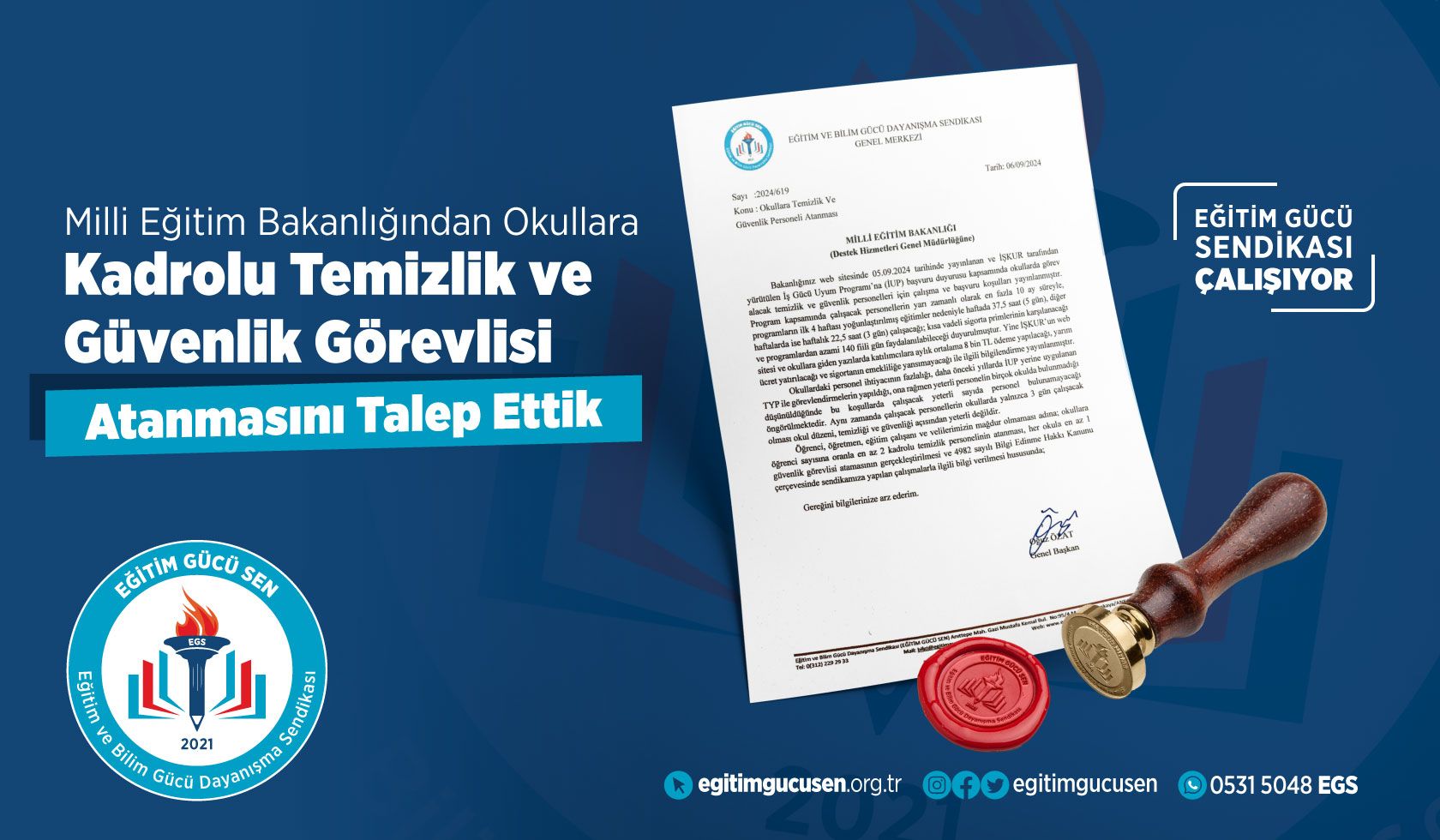 Öğrenci, öğretmen, eğitim çalışanı ve velilerimizin mağdur olmaması adına; okullara öğrenci sayısına oranla en az 2 kadrolu temizlik personelinin atanması, her okula en az 1 güvenlik görevlisi atamasının gerçekleştirilmesini Milli Eğitim Bakanlığından talep ettik.