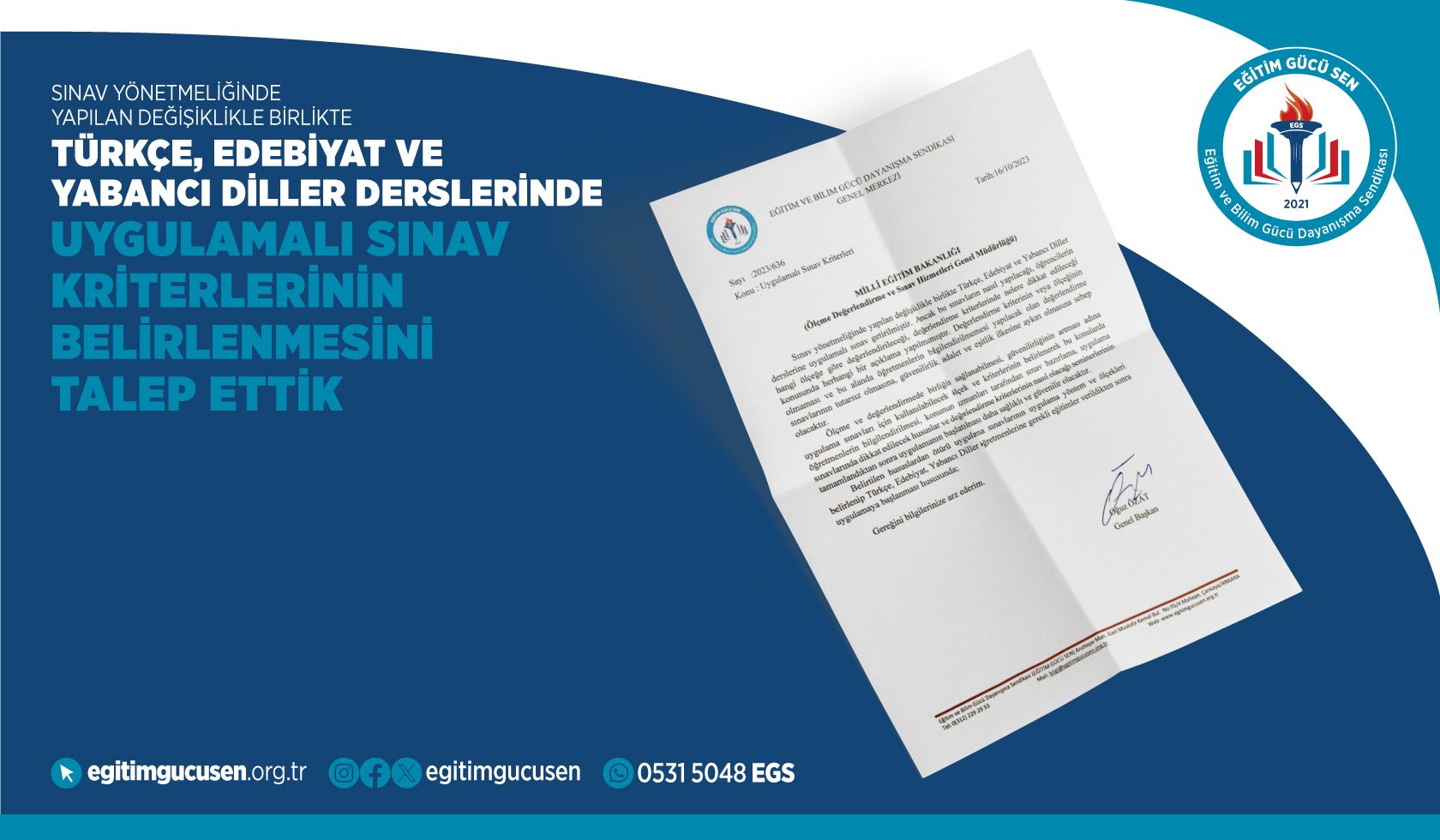 Belirtilen hususlardan ötürü uygulama sınavlarının uygulama yöntem ve ölçekleri belirlenip Türkçe, Edebiyat, Yabancı Diller öğretmenlerine gerekli eğitimler verildikten sonra uygulamaya başlanmasını talep ettik.