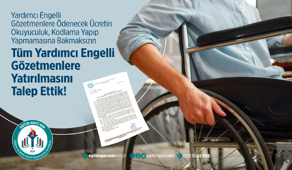 İlgili yönergede değişiklik yapılarak; yardımcı engelli gözetmenlerine ödenecek ücretin okuyuculuk, kodlayıcılık yapıp yapmamasına bakılmaksızın tüm yardımcı engelli gözetmenlere yatırılmasını talep ettik.